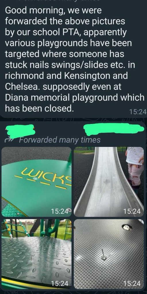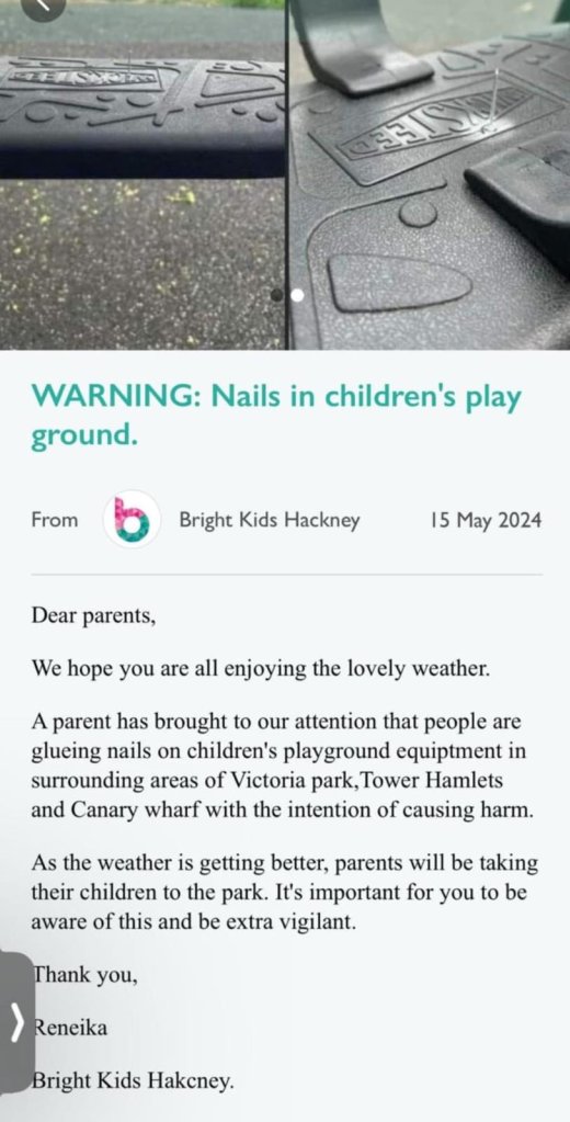 We became aware that there was a warning to parents in Tower Hamlets on a WhatsApp group and the message was forwarded to us. It read: ” Hello, anyone who takes their children to park around Tower Hamlets please be mindful recently some parents have found nails/shape objects placed on swings/slides to cause harm. “