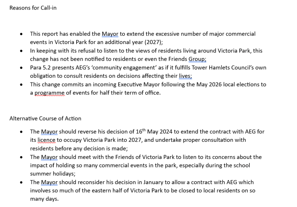 The events planning for the park has been extended by the London Borough of Tower Hamlets. That decision has been called in by Cllr Mark Francis. See Council docs about this issue. The call in to be heard by the Overview and Scrutiny Committee on 18. June 2024. Here is the link to watch online. https://towerhamlets.public-i.tv/core/portal/webcast_interactive/885568?force_language_code=en_GB