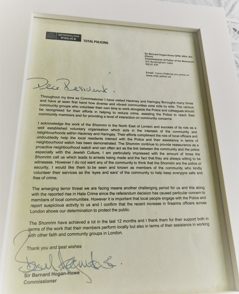 In the case of Shomrim that is a professional Neighbourhood Patrol organisation, which has been getting special dispensation from then Commissioner Hogan-Howe.