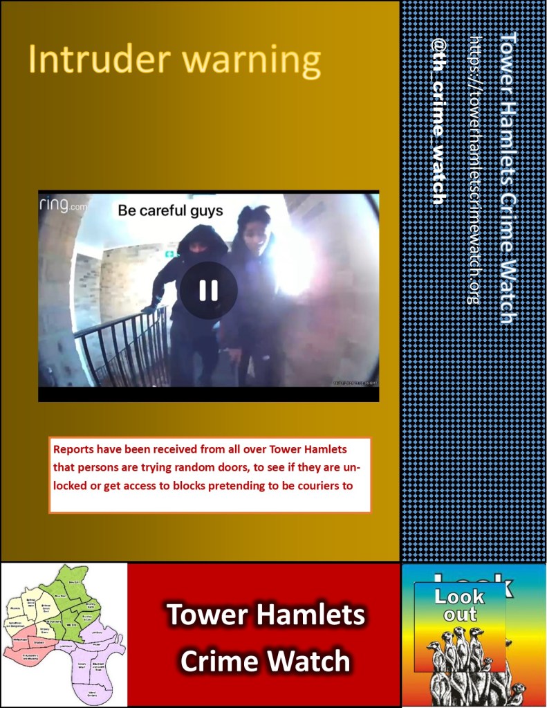 The case was reported to police via 999 who did not attend but gave a CAD number. Tower Hamlets THEO’s advised to keep the area busy to stop prowlers trying to gain entry.