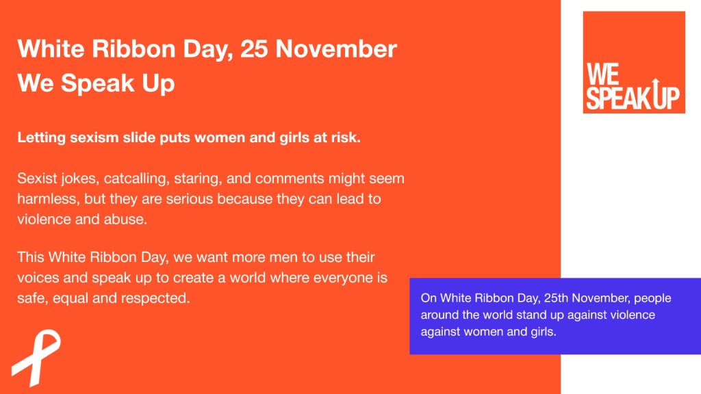 Everyone can speak up this White Ribbon Day by sharing a photo or video on social media, at work and with friends and family saying why you speak up for women and girls.