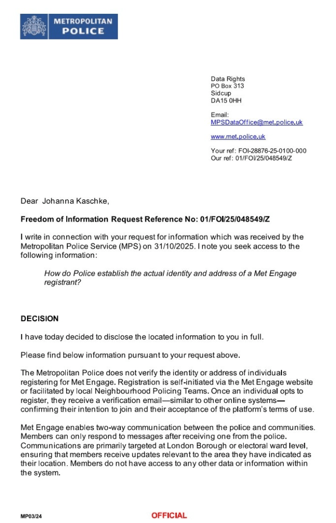 Met Police tries to close that gap of engagement by installing Met Engage but as I have proof, Met Engage, never ever checks the details of it’s registrants. Anybody can register in any area unchallenged. It seems ward priorities are determined by the attendance of a handful of people and submissions made via Met Engage from unknown people and of course the statistics the local police has collected.