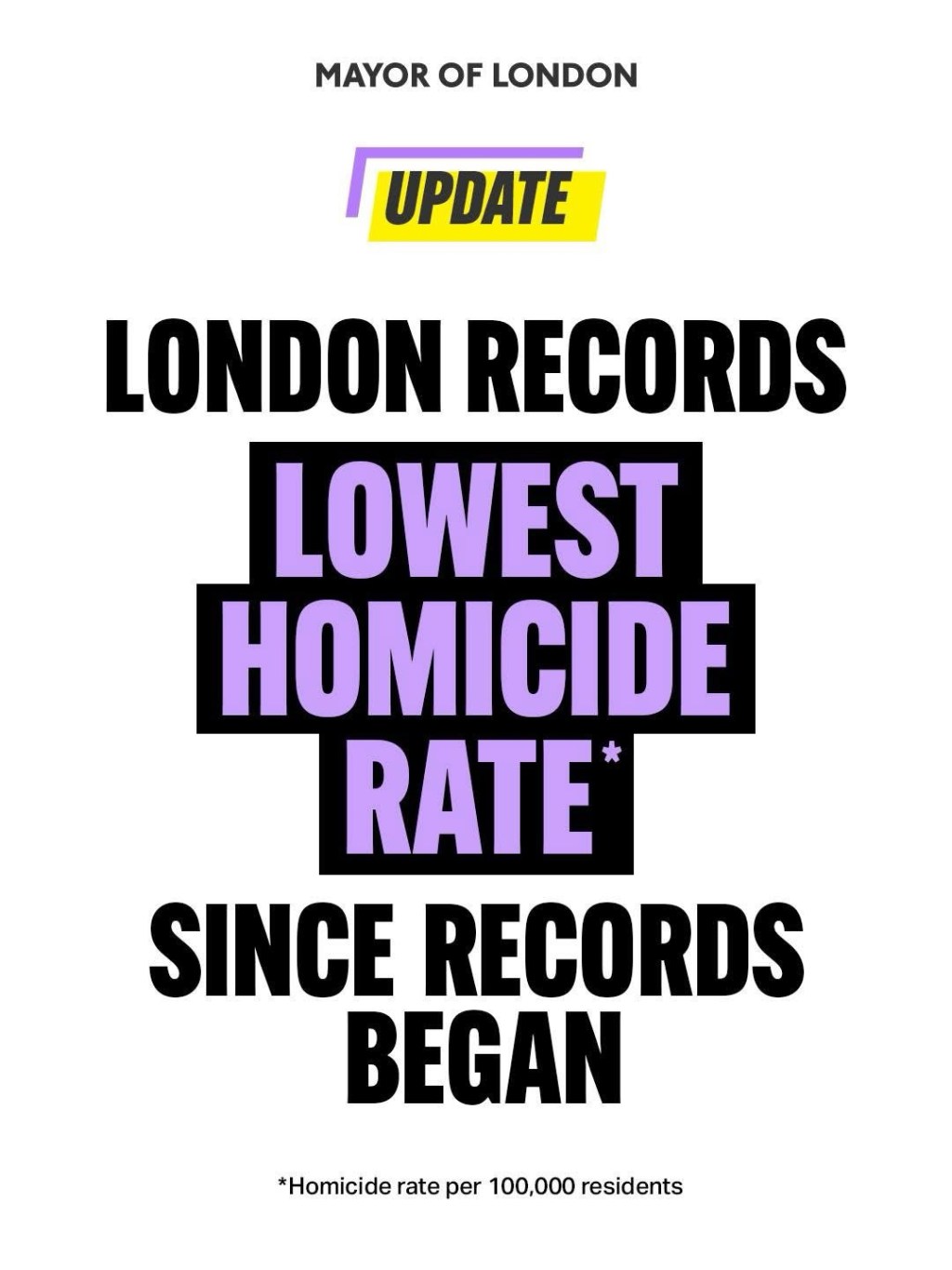 97 homicides in 2025, an 11% reduction on 2024 (109) – this represents the lowest total since 2014, with London’s population having risen by more than half a million since then.
