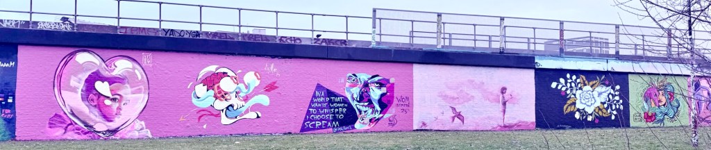 The area attracts guided tours and sports graffiti everywhere. Allen Gardens is a Mecca for it, it changes daily.