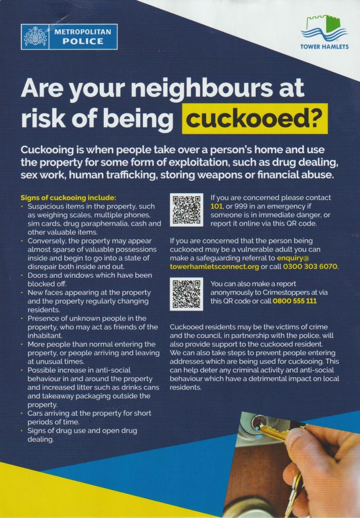 Cuckooed residents may be the victims of crime and the council in partnership with the police, will also provide support to the cuckooed resident. Council can also take steps to prevent people entering addresses, which are being used for cuckooing. This can help deter any criminal activity and anti-social